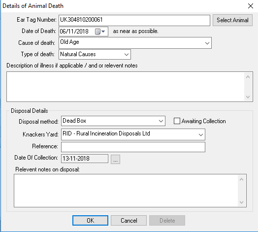 Pressing "Record Death" opens a form to record the details of the death, fill in the details and press "OK".